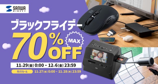 サンワサプライ株式会社(本社:岡山市北区田町1-10-1、 代表取締役社長 山田 和範)が運営するサンワダイレクト Amazon店は、Amazon.co.jpにて1826製品が最大70%OFFになるタイムセールを11月27日(水)から12月6日(金)までの10日間開催いたします。