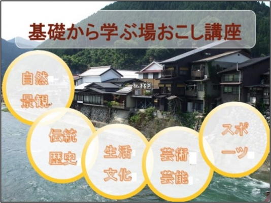 【場おこし講座とは】全国各地域で「まちづくり・まちおこし」に関わっている方々を対象に1.どのようにまちづくり「場おこし」を進めるか 2.場おこし活動の体系 3.特徴的な地域資源も観光特産も何もないという地域でも資源を探せるノウハウ 4.観光特産品を創る手順と評価 5.特産物・特産品の製品評価の活用方法、などを学ぶための講座です。