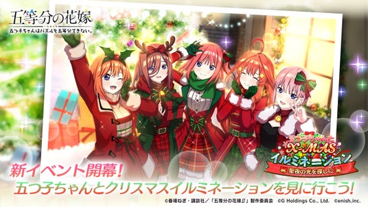 株式会社enish(本社:東京都港区、代表取締役社長:安徳 孝平、以下enish)は、2024年12月6日(金)より、アニメ「五等分の花嫁」初となるゲームアプリ『五等分の花嫁 五つ子ちゃんはパズルを五等分できない。』にて、週刊少年マガジン編集部完全監修のゲームオリジナルストーリーをお楽しみいただける新イベント「五つ子ちゃんとXmasイルミネーション ~聖夜の光を探しに~」を開催いたします。