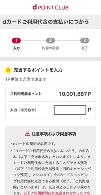 dポイントクラブサイト( (リンク ») )またはdポイントクラブアプリからログインし、ご希望のdポイント数を入力するだけで、最短翌月請求分の「dカードショッピングご利用代金」に充当することができます。