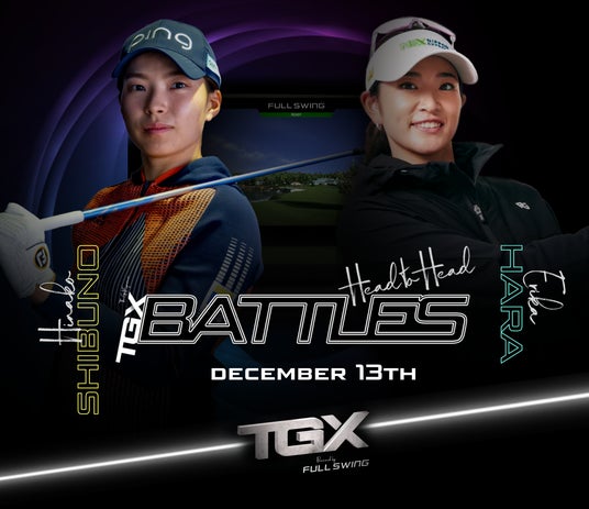 『TGX バトルズ』は、最新のゴルフシミュレーションテクノロジーを駆使したバーチャルゴルフイベントです。タイガー・ウッズ、ジョン・ラーム、渋野日向子選手なども愛用する業界をリードするインドアシミュレーター『FULL SWING』を採用。現実世界と仮想空間のボール軌道をタイムラグなく1つのボールが結ぶ最先端の技術で、室内でありながら実際のツアー競技さながらのプレーを演出します。