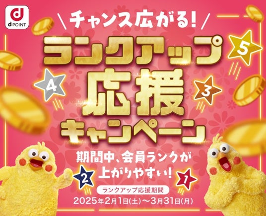 株式会社NTTドコモ(以下、ドコモ)は、各種キャンペーンで獲得できるdポイント(以下、キャンペーンポイント)が期間限定で会員ランク判定の対象となる「チャンス広がる!ランクアップ応援キャンペーン」(以下、本キャンペーン)を2025年2月1日(土)から開催いたします。本キャンペーンは2025年2月1日(土)から2025年3月31日(月)までの期間に開催される各種キャンペーン※3が対象です。