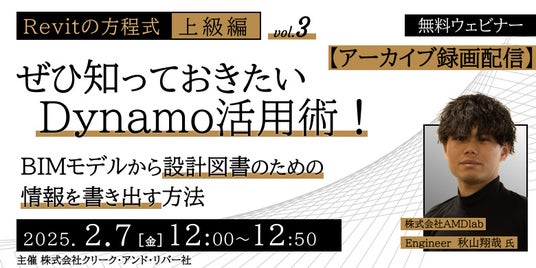 株式会社クリーク・アンド・リバー社(C&R社)は2月7日(金)、BIMソフトウェア「Revit」の中上級者の方々を対象として、2024年1月に開催したオンラインセミナー「【Revitの方程式・上級編vol.3】ぜひ知っておきたいDynamo活用術!BIMモデルから設計図書のための情報を書き出す方法」のアーカイブ映像を無料配信します。