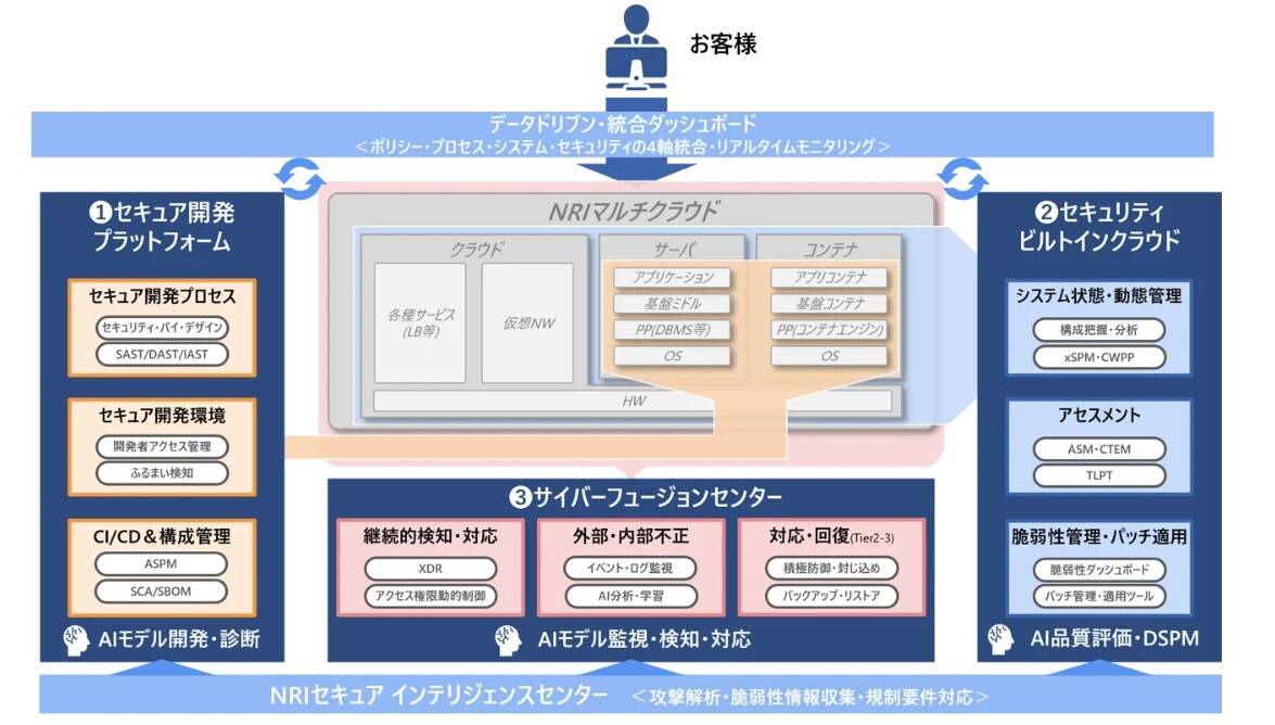 NRIのマルチクラウド環境「NRIマルチクラウド」にセキュリティ機能を組み込み、IT基盤構築とセキュリティ運用がビルトインされたクラウド環境を提供します。具体的には、構成把握・分析や脆弱性ダッシュボード、アセスメントのASM[ix]、CTEM[x]、クラウドセキュリティツールのxSPM[xi]やCWPP[xii]にも連携しています。運用における脆弱性管理やパッチ適用をシームレスに実行し、法規制遵守を支えます。