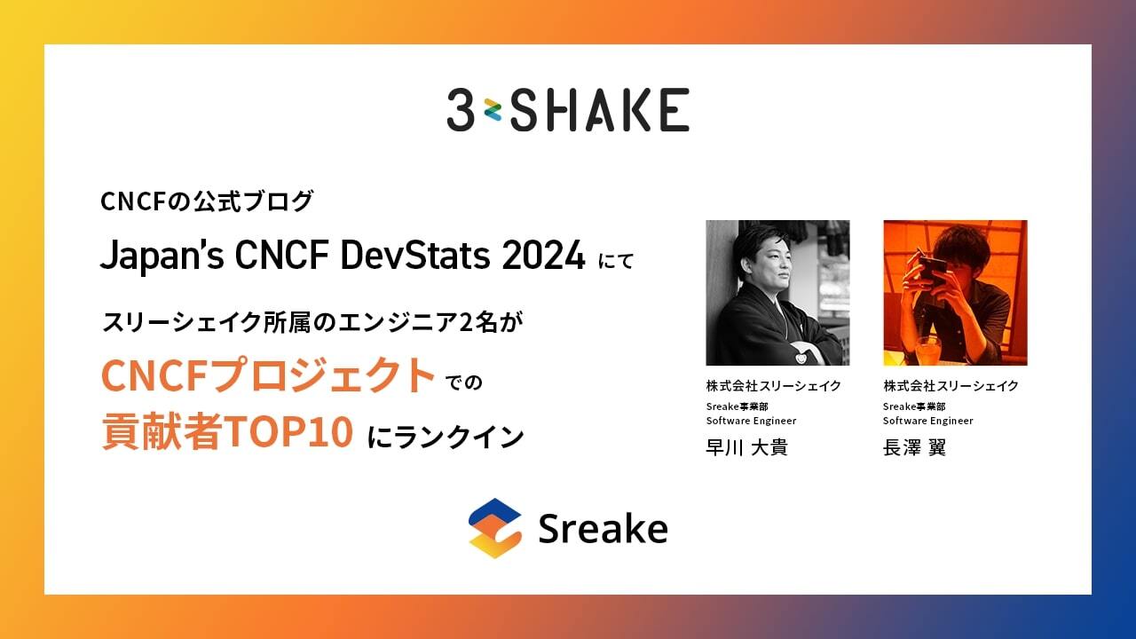 3-shake Inc. (Headquarters: Shinjuku, Tokyo; CEO: Takuma Yoshida) is pleased to announce that our engineers, Daiki Hayakawa and Tsubasa Nagasawa, have been ranked among the top 10 contributors to CNCF projects in the official CNCF (Cloud Native Computing Foundation) blog post, "Japan’s CNCF DevStats 2024."