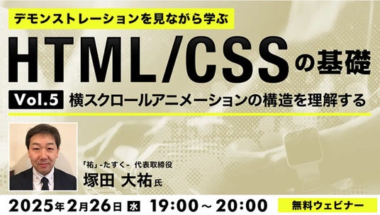 株式会社クリーク・アンド・リバー社(C&R社)は2月26日(水)、Webデザイナー、コーダーの方や専門学校やスクールでWebの勉強をされている方を対象に、無料のオンラインセミナー「デモンストレーションを見ながら学ぶ HTML/CSSの基礎(5) ~横スクロールアニメーションの構造を理解する~」を開催します。