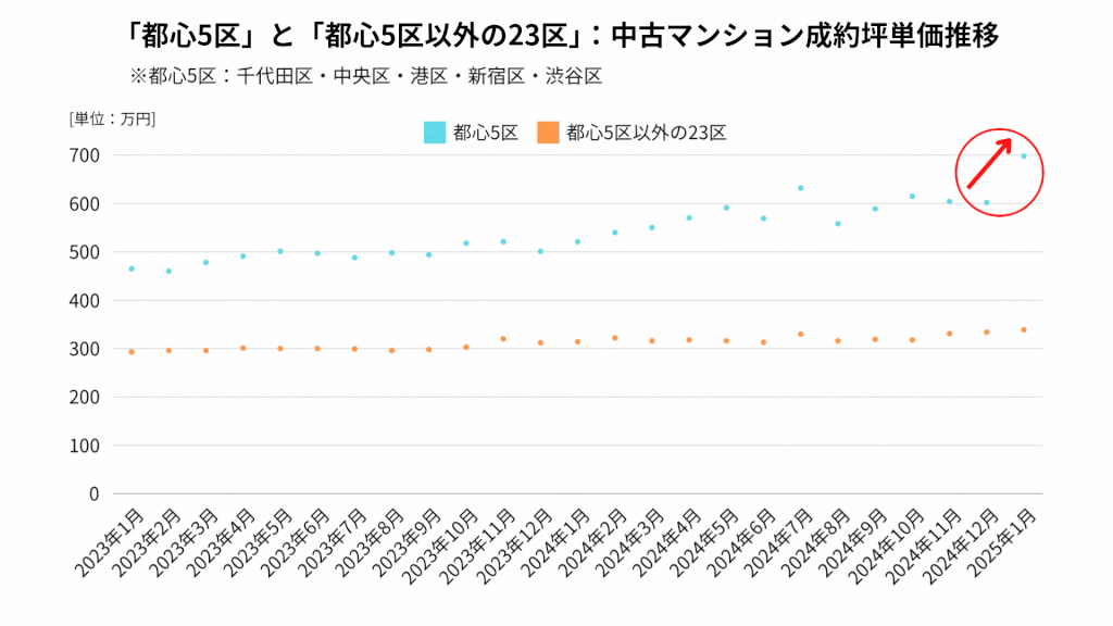 都心5区(千代田区、中央区、港区、新宿区、渋谷区)では、中古マンションの価格が大幅に上昇しています。特に2024年12月から2025年1月にかけて、急激な価格上昇が見られました。