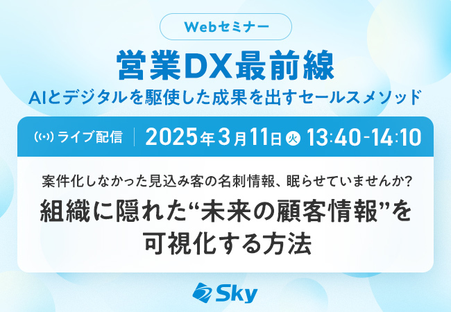 “元”見込み顧客の情報は多くの企業に眠っているのではないでしょうか。本セミナーでは、組織に眠ったままになっているリードを有効活用する方法などを営業名刺管理「SKYPCE」の効果的な活用方法と併せてご紹介します。