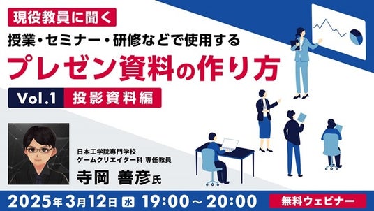 第1回「投影資料編」(3月12日[水]開催)では、プレゼン資料に落とし込む前の準備から、構成、シナリオ作り、資料への反映までをご紹介します。また、第2回「動画資料編」(3月26日[水]開催)では、フォローアップ用の解説動画や作業方法をレクチャーする動画など、動画の方がわかりやすい資料・教材を作成する際のポイントをお伝えします。講師を務めるのは、日本工学院専門学校ゲームクリエイター科専任教員としてご活躍されている寺岡善彦氏。生徒にさまざまな知識や技術を習得してもらうために試行錯誤してきた寺岡氏のノウハウが満載のセミナーです。プレゼン資料の作成が苦手な方や相手に伝える方法を知りたい方、研修・セミナーで登壇する予定がある方、講師業に興味のある方などにおすすめです。ぜひご参加ください。