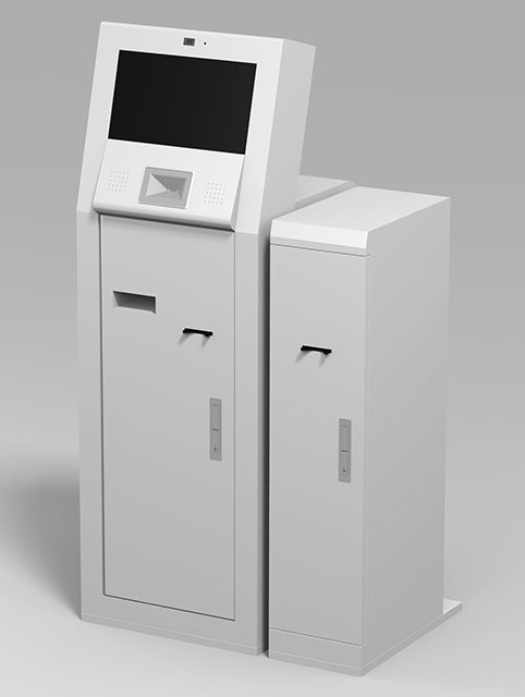ICカード発行機を搭載した補助端末を追加することで2種類のICカードに対応し、来訪予約時に送信されたQRコードを読み取ると来訪先ごとに指定されたICカードが発行されるKiosk端末です。