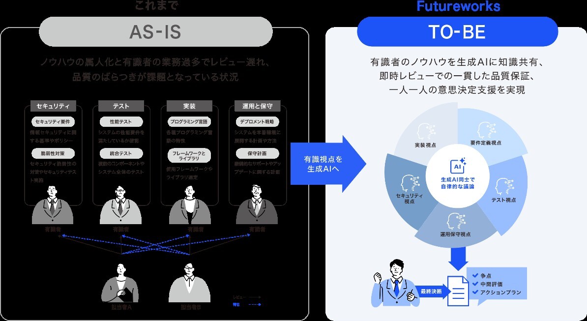 本ソリューションは、単純な生成AIサービスの利用では難しい、システム開発における要件定義書などの高度なドキュメントのレビューを、専門家の知見を反映した複数のAI人格との対話などの技術により実現する画期的なソリューションです。