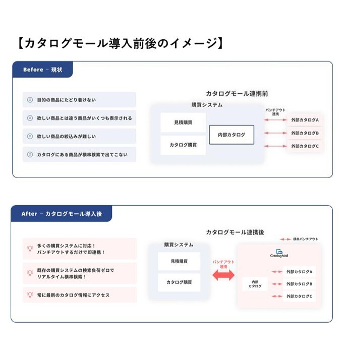 多くの企業で必要となる調達購買業務の課題を解決するため、当社の調達購買DXソリューションの中で評価が高い「カタログモール」の機能を単独で提供開始し、既に利用している購買システムをリプレイスすることなく、低コストで横串検索機能を導入可能にすることで、サプライヤー側が提供する商品情報を適切に購買者に届け、サプライヤー側・購買者側双方の業務効率化を実現します。