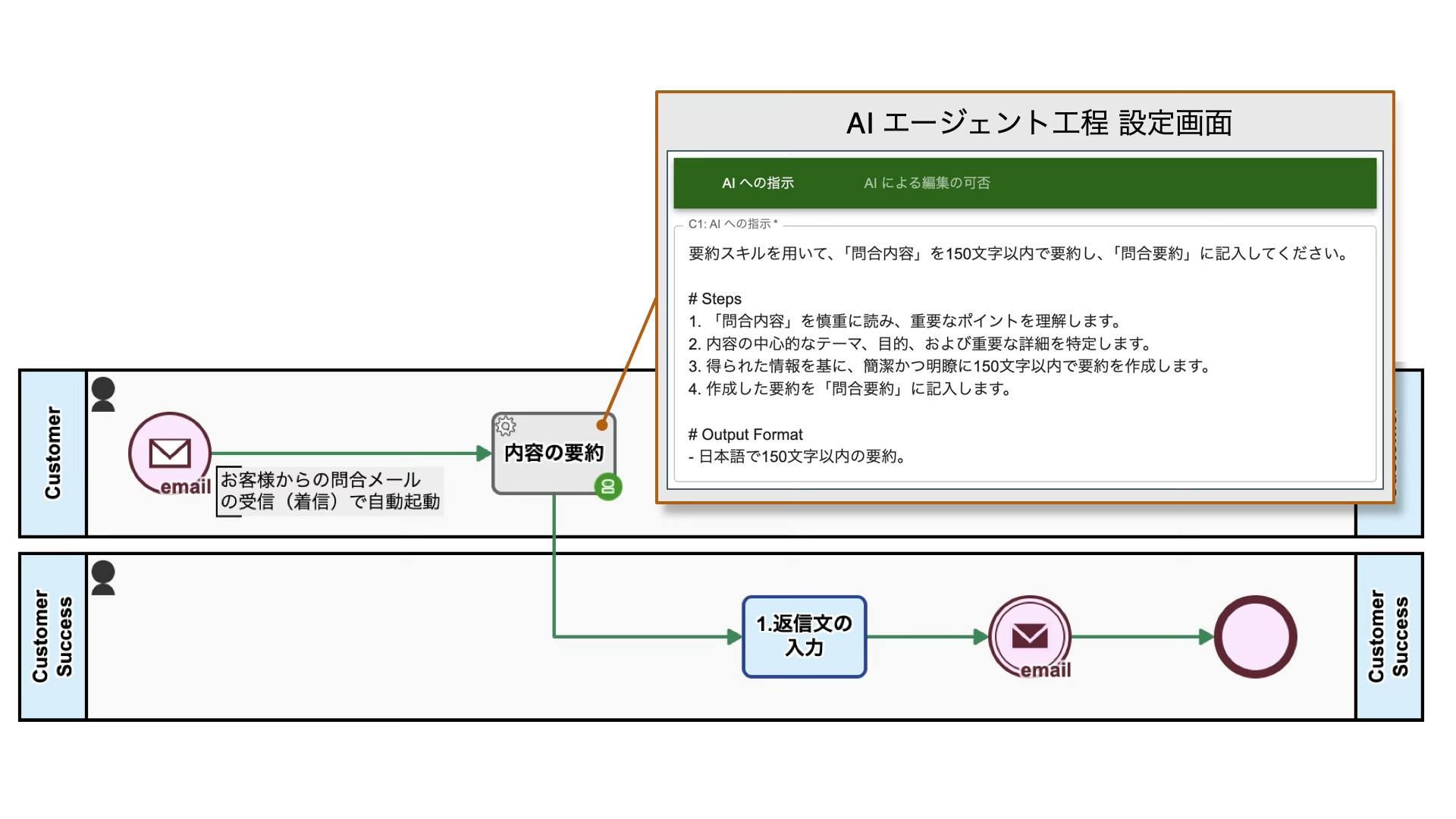 本機能により、「生成AI処理」を、ワークフローアプリ内に組み込めるようになります。例えば、現場部門担当者が、工程の設定に「問合内容を簡潔に要約する」と書いておくだけで、全ての問い合わせが自動的に要約されるようになります。