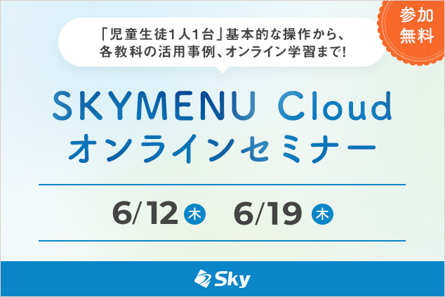 実際の授業を想定した活用シーンに合わせて「SKYMENU Cloud」の操作をご体験いただけるセミナーです。操作方法や活用場面などに関するご質問も承りますので、ぜひお気軽に「SKYMENU Cloud」をご体験ください。