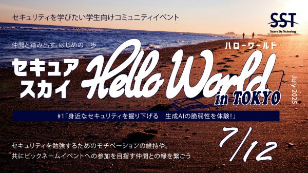 「セキュアスカイ Hello World」は、セキュリティ関連のイベントや活動に参加したいものの、知識や技術に自信がない学生たちのはじめの一歩となるような、基礎的なWebセキュリティの勉強や、セキュリティ業界について詳しく知ることができるテーマを中心に扱うイベントです。また、部活動のようにみんなで集まり、学生向けのバグハンティングコンテスト(システムの脆弱性を見つけ出す活動)やCTF(セキュリティに関する課題を解く競技形式のイベント)に向けた学習に取り組む場も提供します。