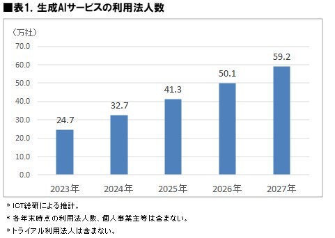 日本国内における生成AIサービスの法人利用は、急速な拡大局面を迎えている。ICT総研では2023年末時点で24.7万社が何らかの形で生成AIサービスを業務に導入していると推計しており、2024年末には32.7万社、2025年末には41.3万社に達する見込みである。さらに、2026年には50.1万社、2027年末には59.2万社にまで拡大すると予測しており、法人領域における生成AIの定着が急速に進んでいる。