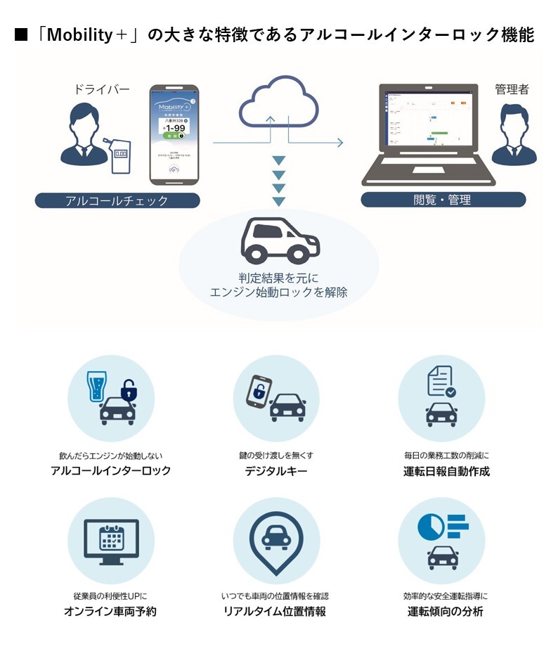 Mobility+は、オンライン車両予約や日報自動作成等の一般的な車両管理ソリューション基本機能に加え、アルコールインターロックやデジタルキー機能を搭載し、車両管理業務の効率化と安全運転推進を実現する新しいトータル車両管理ソリューションです。