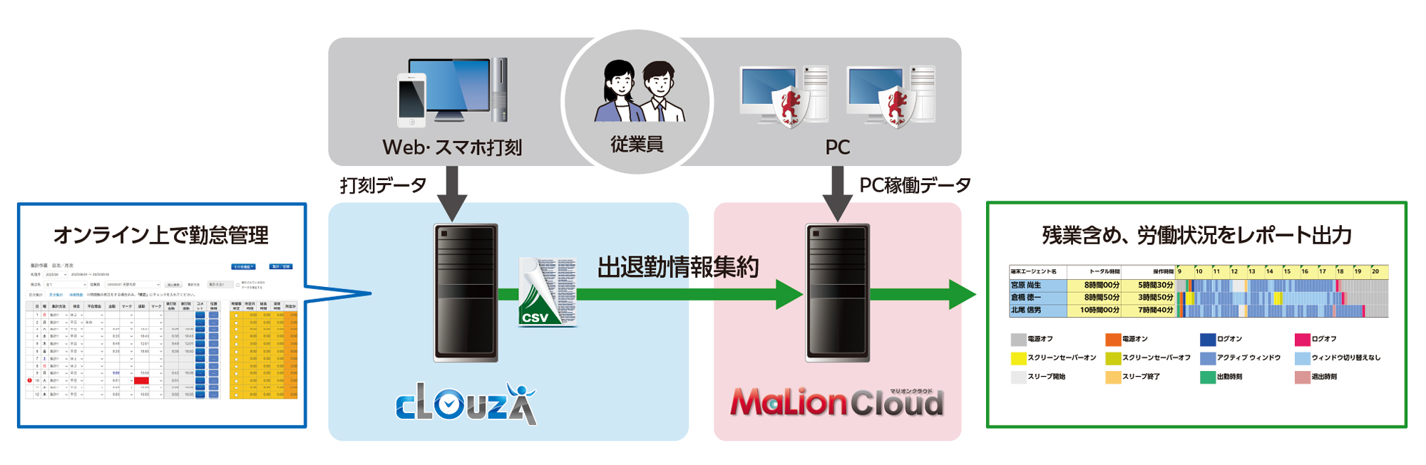 「CLOUZA」が管理する打刻データを「MaLionCloud」に取り込むことで、打刻と実働時間の乖離から従業員の残業を把握することができます。例えば、勤務時間外に従業員がPCで作業をしていた場合、PC画面がアクティブであることが「MaLionCloud」にログとして記録されます。「MaLionCloud」内で「CLOUZA」の打刻データとPC稼働ログを突合させることで、打刻と実働の差異が可視化され「隠れ残業」が一目で確認できます。