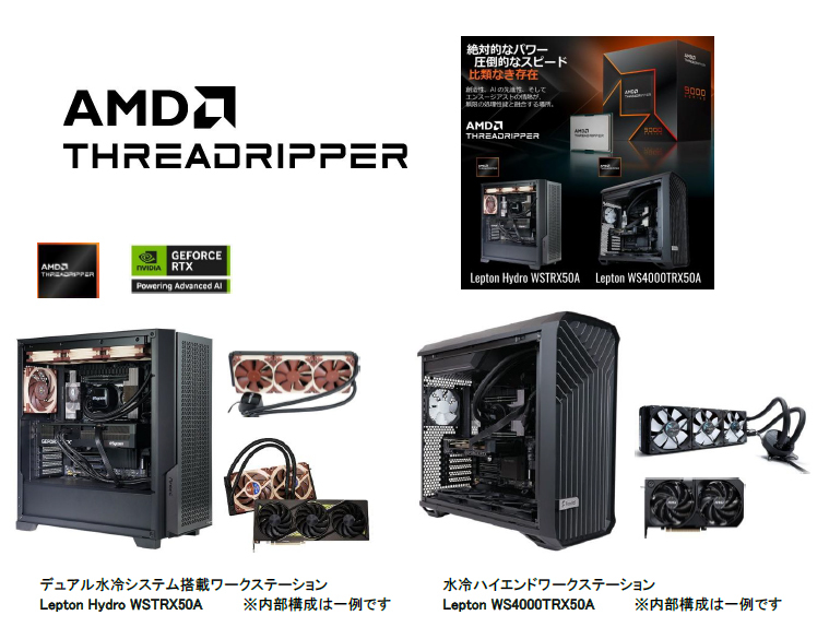 AMD Ryzen(TM) Threadripper(TM) 9000シリーズはワークステーションおよびHEDT向けのプロセッサで、当社で取り扱うラインナップはHEDT向けのAMD Ryzen(TM) Threadripper(TM) 9960X、AMD Ryzen(TM) Threadripper(TM) 9970X、AMD Ryzen(TM) Threadripper(TM) 9980Xです。最新のZen 5アーキテクチャに最大64コア/128スレッド、最大256MBのL3キャッシュを備えており、AI処理で必要な高性能CPU、GPU、メモリ、ストレージを搭載する当社のプロフェッショナル向けのワークステーション「Lepton」シリーズの2機種「Lepton Hydro WSTRX50A」と「Lepton WS4000TRX50A」で搭載し発売します。