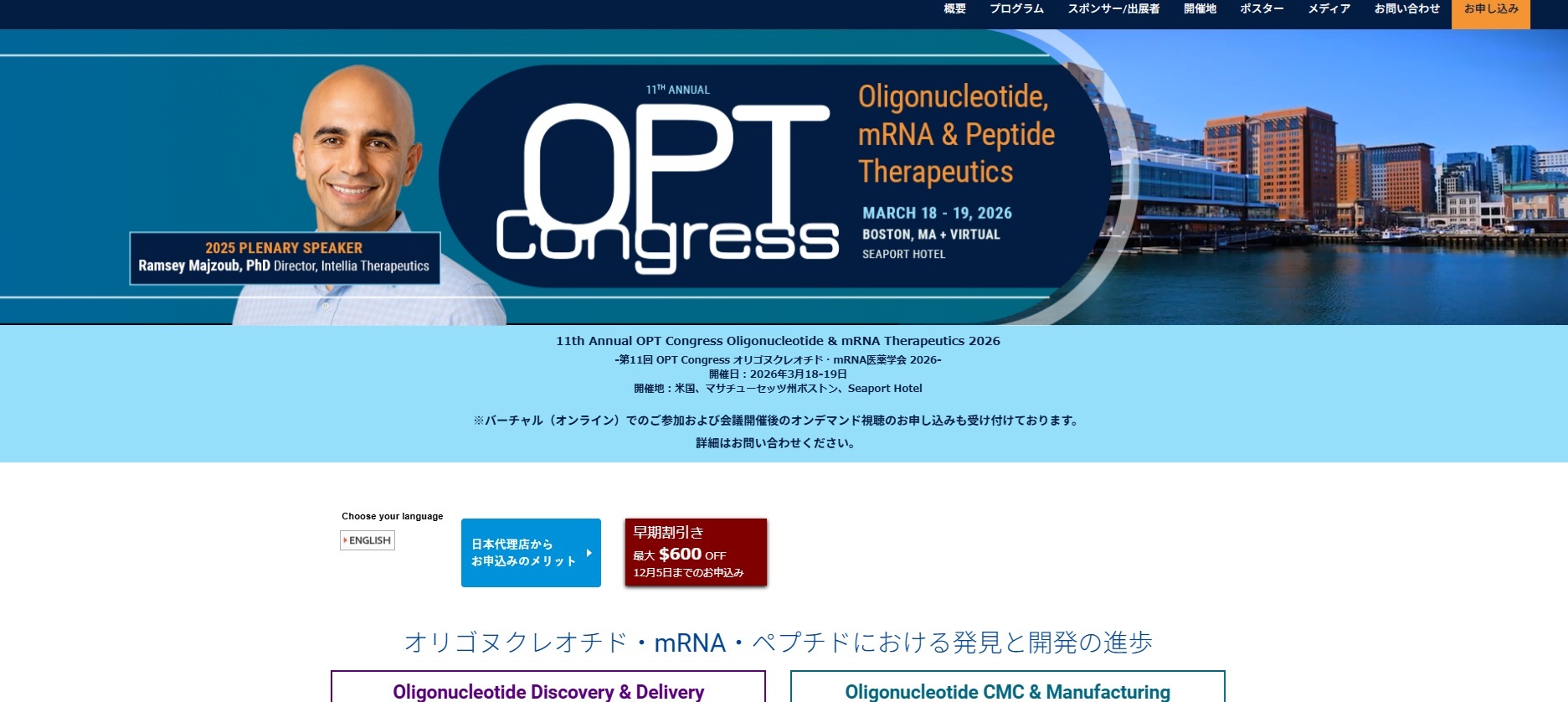 11th Annual OPT Congress Oligonucleotide & mRNA Therapeutics 2026にご参加希望の方は、お早めにお申し込みください。