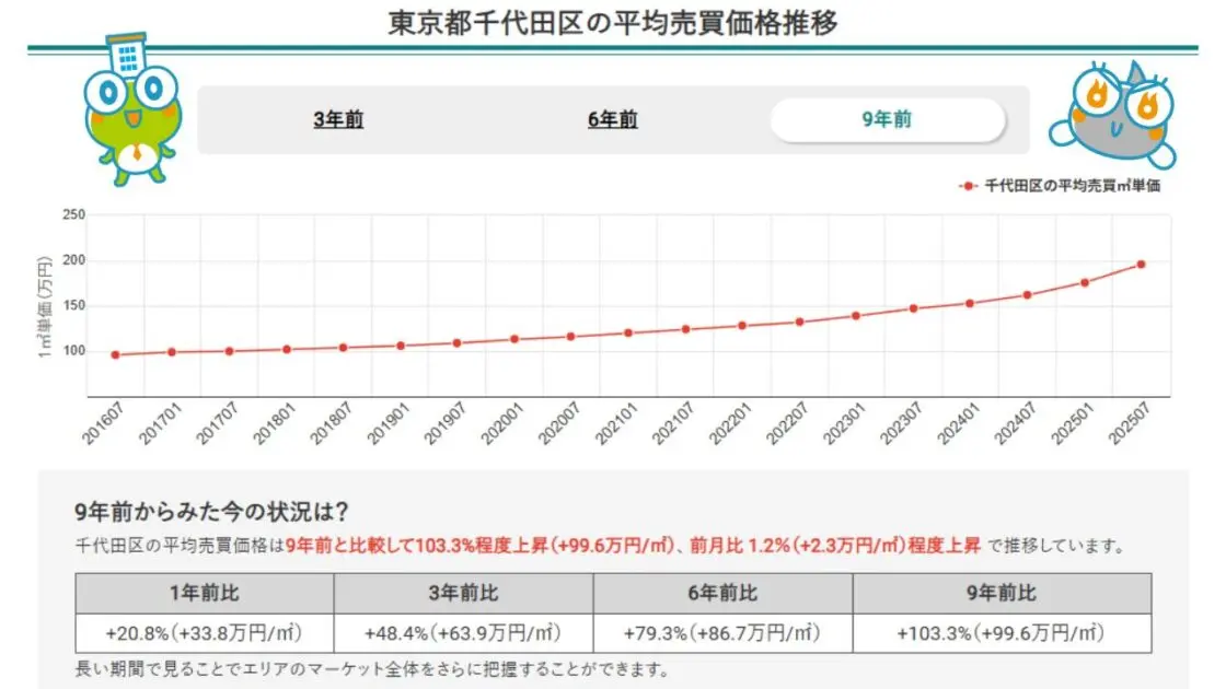 千代田区の2025年7月時点での中古マンションの平均売買㎡単価は196万円で、9年前の基準値と比較して103.3%もの上昇率を記録しています。