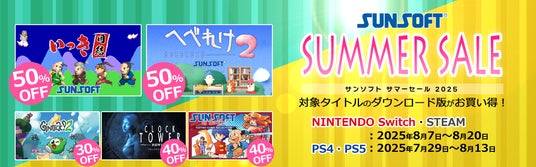 サンソフト(サン電子株式会社)は、各種プラットフォームにてダウンロード版のゲームをお得に購入できる「サンソフト サマーセール 2025」を開催中です。