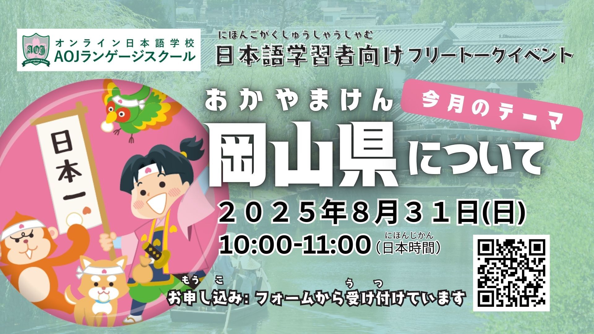 日本語学習者向けのオンラインフリートークイベント「日本語で話そう!」8月31日(日)10:00〜11:00に開催します。日本語学習者同士で、テーマに沿って日本語での会話練習を行うことができるイベントです。今回のテーマは「岡山県について」です。お申し込みはフォームより受け付けています。日本語を練習し、日本が好きな新しい友達を作るこの無料の機会に、ぜひお申し込みください。