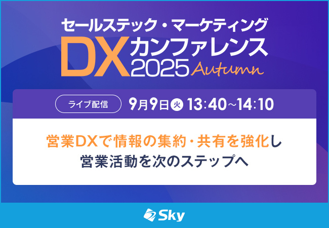 人材不足や売り上げ不振など「ひと・もの・かね」の問題が多くの企業を悩ませています。重要なのは、組織に散在する情報を集約・共有し、営業活動の精度を高めること。本セミナーでは、SKYPCEを活用した組織全体でのスムーズな顧客情報の共有についてご紹介します。