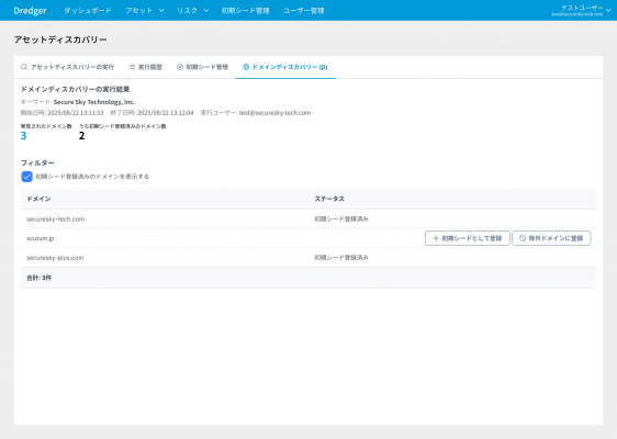 キーワード(英文組織名またはメールアドレス)をもとに、関連する初期シード相当のドメインを探索できる機能を追加しました。発見したドメインは初期シードとして登録でき、アセットディスカバリーの対象とすることでサブドメインを含むアセット探索が可能です。