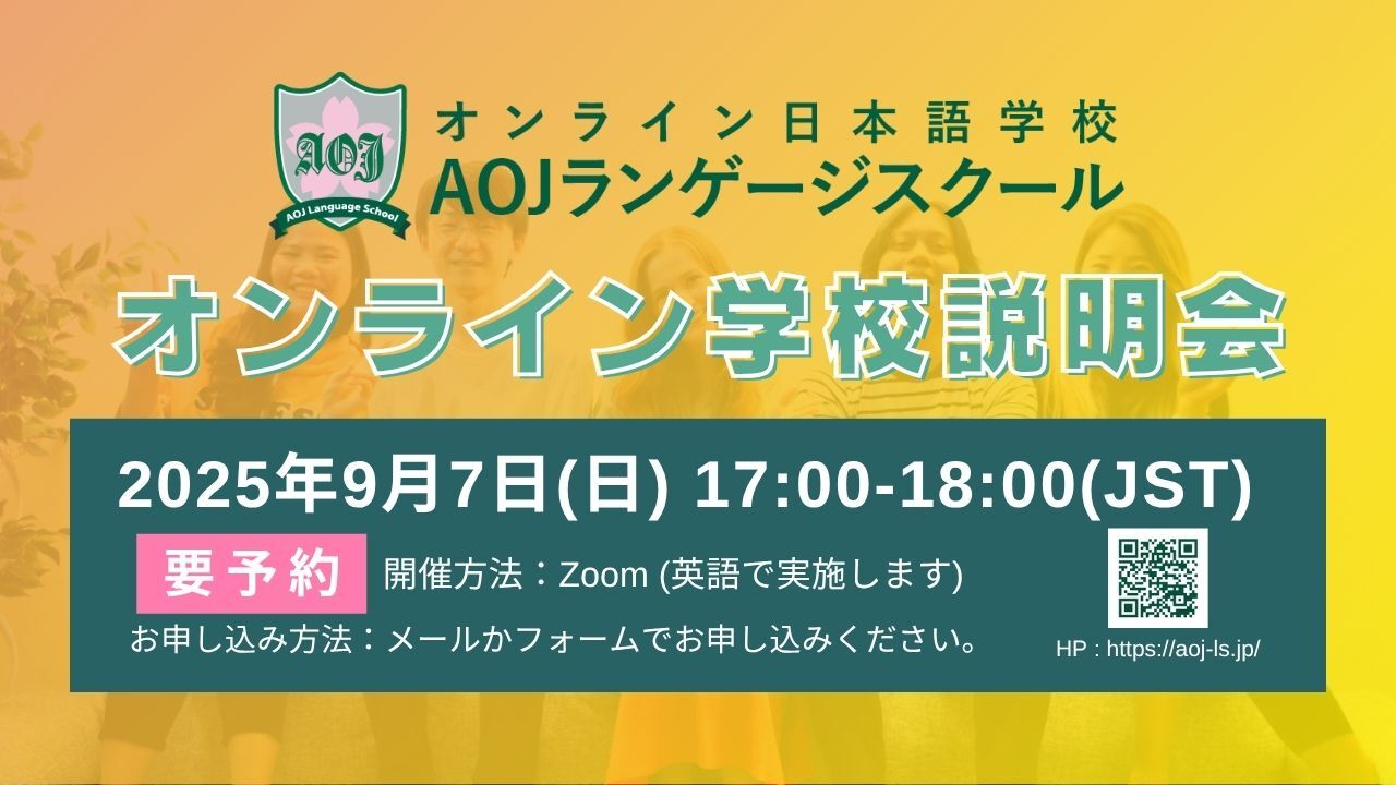 オンライン日本語学校AOJランゲージスクールにて、2025年秋学期開講に向け、第2回オンライン入学説明会を日本時間9月7日(日)17:00-18:00に開催します。参加には事前申し込みが必要です。HPより承っておりますので、是非お申し込みください。https://forms.gle/wh9FpybyERfgU8CMA