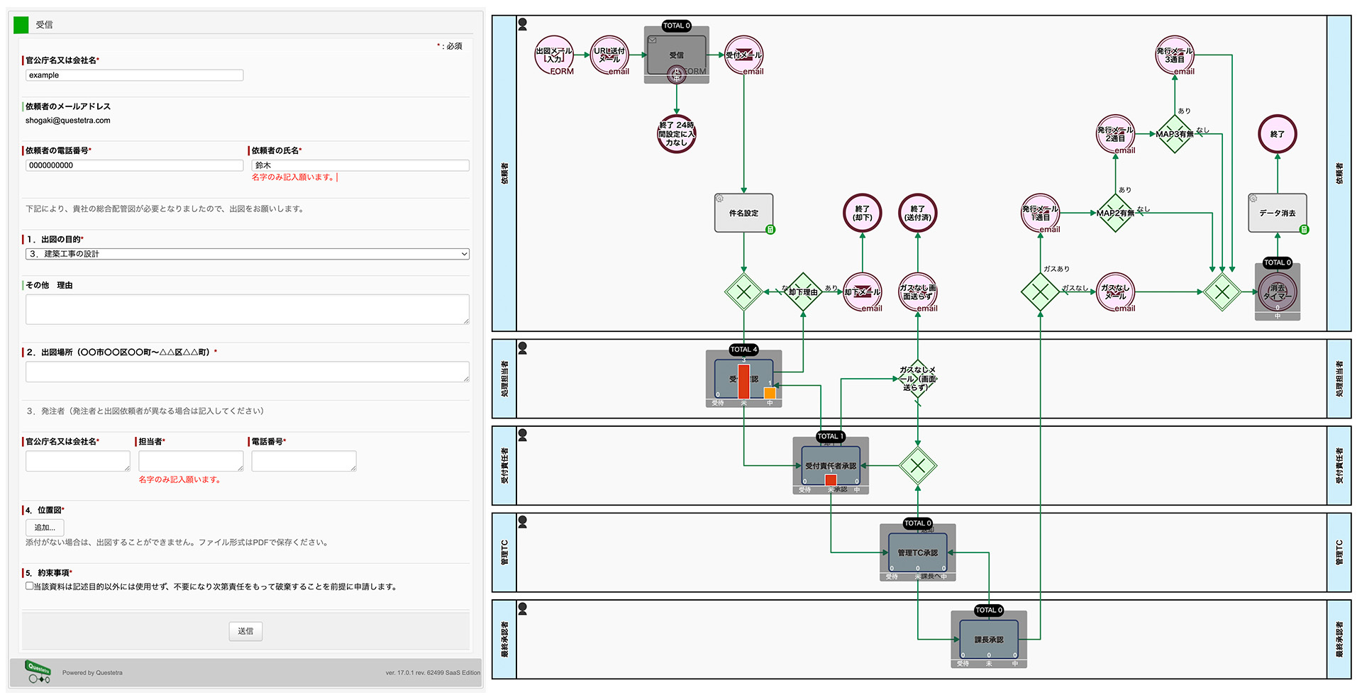 実際のWEBフォーム画面(左)/ワークフロー図進行中案件のステータス(ヒートマップ)(右)