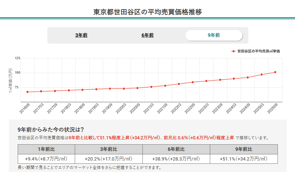 2.2025年9月時点での東京都全体のマンション価格は9年間で66.6%上昇し、安定した増加傾向