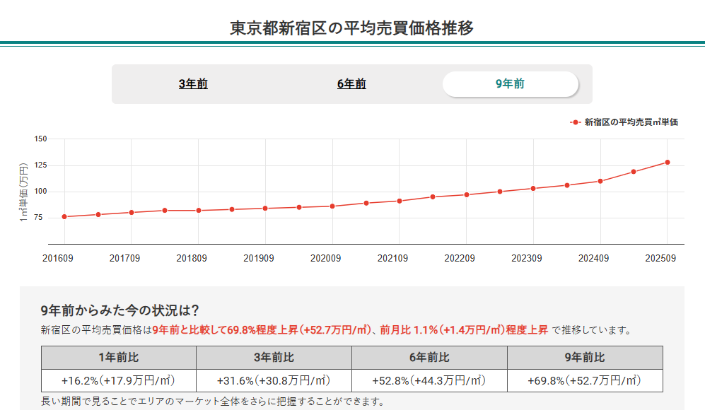 また、新宿区の平均売買平米単価は128万円で、9年前と比較して約70%の上昇率を記録。
