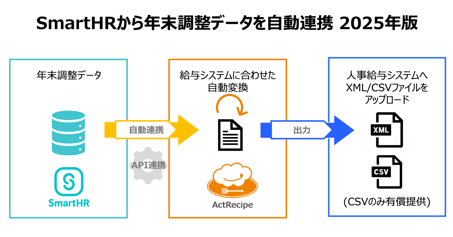 ActRecipeでは、2023年よりSmartHRから年末調整申告書XMLデータを出力する機能を無償で提供してまいりました。2024年版では給与ソフトが個別に求める要件にも対応しており、2025年版ではXMLデータだけでなくCSVファイルでの出力にも対応してまいります。