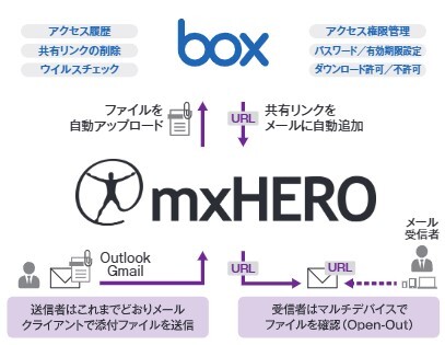 選定の最大要件は “ユーザーの操作を変えないこと”でした。mxHEROは、従来どおりファイルを添付してメールを送信するだけで、自動的に連携するストレージであるBoxへ添付ファイルをアップロードし、受信者にはBoxの共有リンクのみが届く仕組みを提供します。また、Boxにはアクセスログが残るため、監査・追跡性が担保され、誤送信時の影響も最小化できます。このように、ユーザーの利便性を損なうことなくセキュリティを強化できる点が評価され、採用に至りました。また、Outlookアドインの個別配布やユーザー設定が不要で、管理者による一元設定で全社的な利用が可能となります。そのため、グループ全体で約7,500名が利用する環境においても、短期間での導入と安定した運用を実現できました。