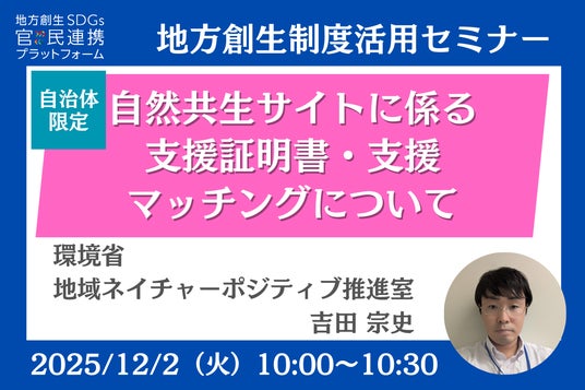 企業版ふるさと納税を活用した地域課題解決プラットフォーム「river(リバー)」を運営する株式会社カルティブ(本社:神奈川県横浜市、代表取締役:池田 清)は各省庁の出している補助金・交付金の活用方法を自治体様向けに伝える「地方創生制度活用シリーズセミナー」として、2025年12月2日(火)に環境省担当者による自治体限定オンラインセミナー「自然共生サイトに係る支援証明書・支援マッチングについて~ネイチャーポジティブに貢献する取組を国が認証します~」を開催します。