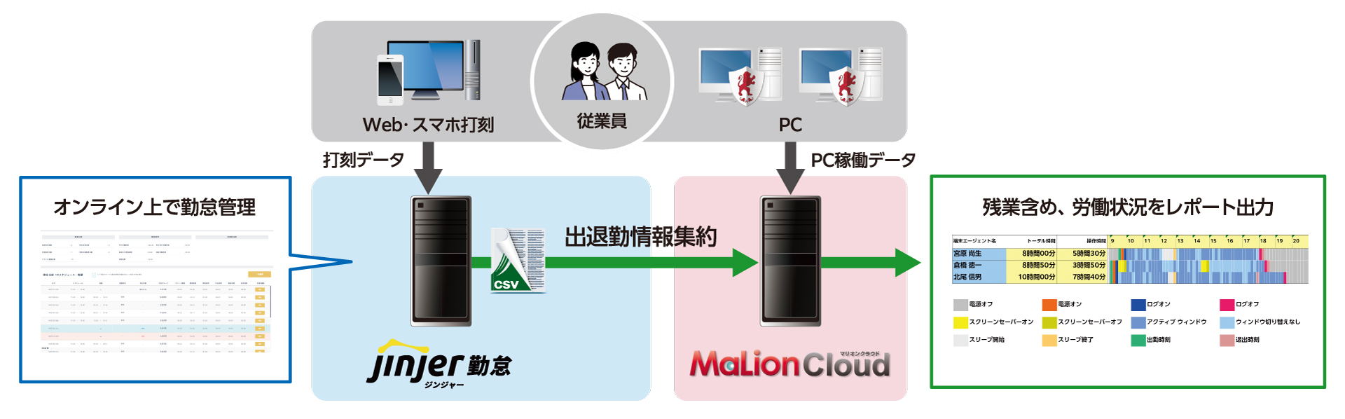 「ジンジャー勤怠」が管理する打刻データを「MaLionCloud」に取り込むことで、打刻と実働時間の乖離を把握できます。勤務時間外のPC操作は「MaLionCloud」にログとして記録されるため、打刻データとの突合により「隠れ残業」を一目で確認できます。