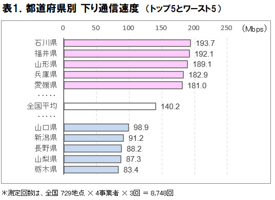 調査の結果、4社平均の下り通信速度トップは石川県であり、193.7Mbpsを記録した。福井県(192.1Mbps)、山形県(189.1Mbps)、兵庫県(182.9Mb