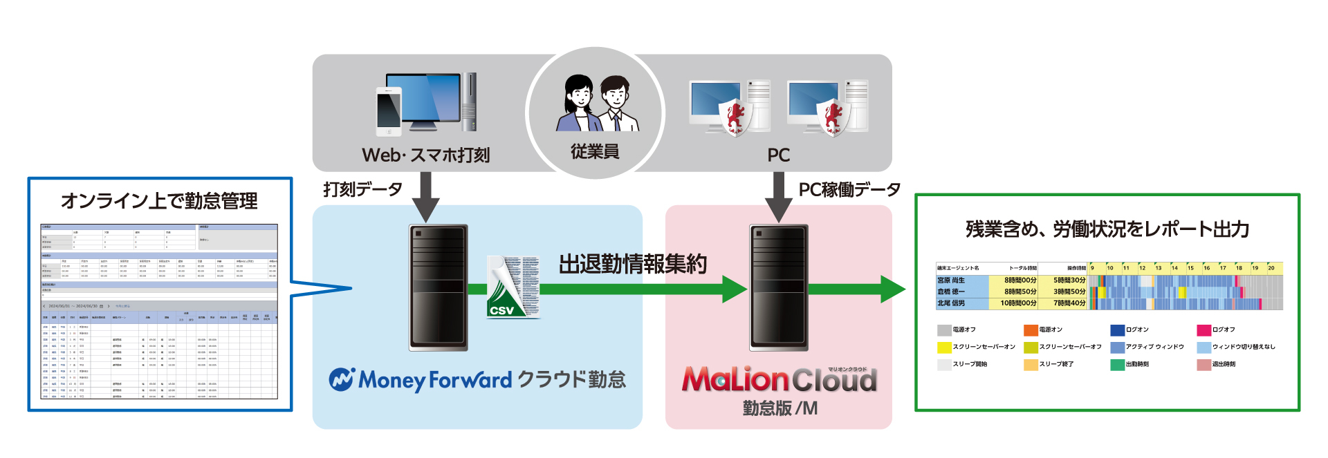 「MaLionCloud勤怠版/M」(読み:マリオンクラウド キンタイバン エム)は、「マネーフォワード クラウド勤怠」と連携し、打刻データとPCログを突合することで、実働時間の乖離や隠れ残業の把握を可能にする、勤怠管理支援に特化したサービスです。