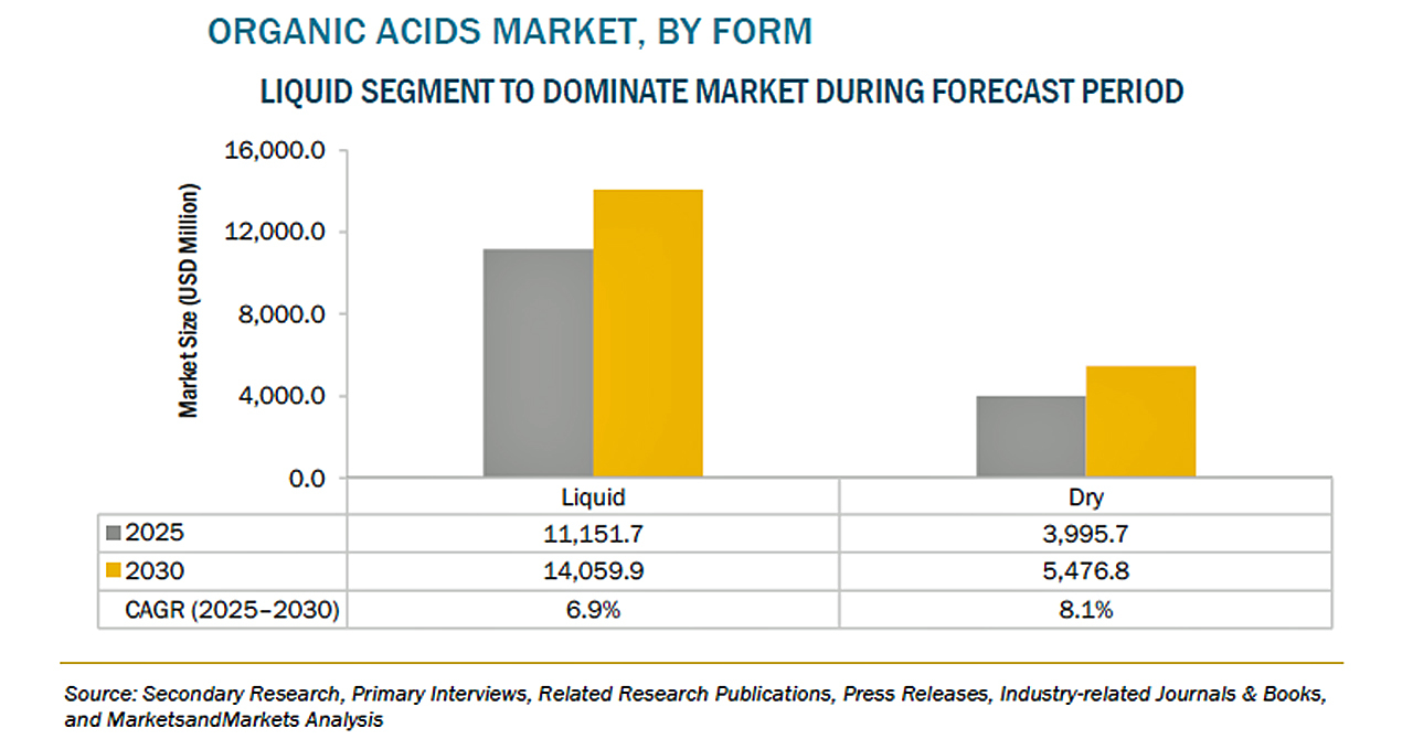 有機酸の乾燥形態は、保存期間の延長、取り扱い容易性、自動化製造・給餌システムとの優れた適合性から、食品・飼料・農業用途において強い支持を得ています。固体状態での安定性は汚染リスクを最小限に抑え、スマートでクローズドループ型の生産環境への統合に最適です。この需要は特に製パン・製菓・加工食品産業で高く、乾燥有機酸は合成保存料を必要とせずに製品の鮮度維持、風味向上、微生物学的安定性を確保します。さらに乾燥形態はコスト効率の良い保管・輸送を可能にし、特殊なコールドチェーンの必要性を排除して物流効率を向上させます。天然・クリーンラベル・持続可能な原料への世界的な移行が加速する中、乾燥有機酸セグメントは着実な成長が見込まれます。カプセル化技術や徐放性製剤の進歩により、その有効性はさらに高まっており、食品保存や飼料改良のための効率的・安定的・環境に優しいソリューションを求める多様な分野での採用を促進しています。