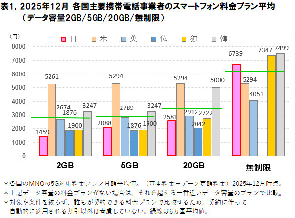 調査対象は日本、アメリカ、イギリス、フランス、ドイツ、韓国の 6 カ国の 主なMNO とし、各国のスマートフォン料金は2025年12月時点のものとした。