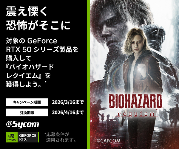 確かな品質でハイパフォーマンスPCの製造を行うパソコンメーカーの株式会社サイコム(本社:埼玉県八潮市/代表取締役:河野 孝史)は、対象のNVIDIA(R) GeForce RTX(TM) 50シリーズを搭載した当社BTOパソコン購入時に、サバイバルホラー『バイオハザード レクイエム』(2026年2月27日発売予定)のゲームコードを記載したクーポンカードを同梱するバンドルキャンペーンを2月10日(火)23時より開始しました。