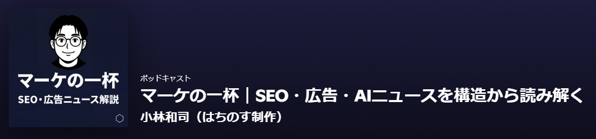 「マーケの一杯」は、SEO・広告・AIに関する最新ニュースを毎日10分で構造から整理する番組です。