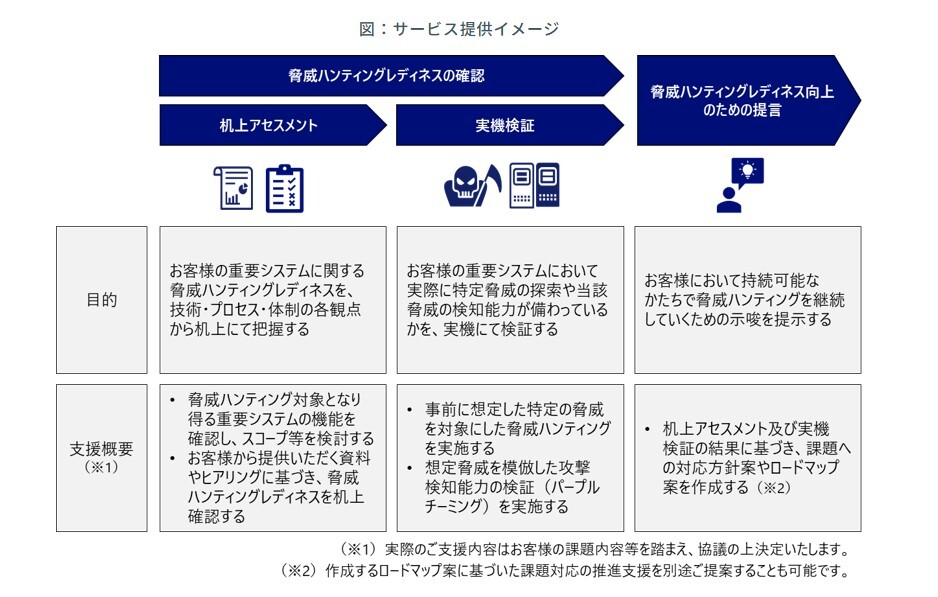 本サービスでは、机上アセスメント及び実機検証を通じて、脅威ハンティングレディネスの構築を支援します。まず、技術・プロセス・体制の各観点から、脅威ハンティングを実施するための準備状況(レディネス)を机上で確認します。その後、お客様の実機で特定の脅威を想定した脅威ハンティングや、想定脅威を模倣した攻撃に対する検知能力の検証(パープルチーミング)を実施します。これらの実施結果を踏まえ、脅威ハンティングレディネスを向上させるための提言を作成し報告します。