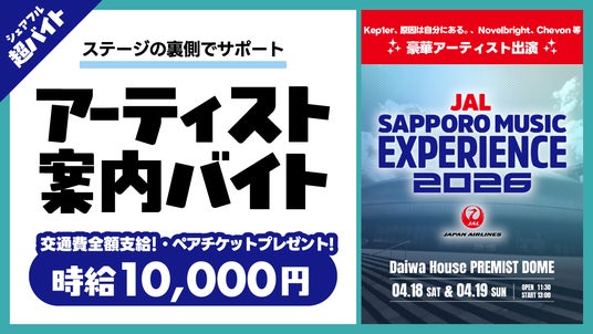 「はたらいて、笑おう。」をビジョンに掲げるパーソルグループのスキマバイトアプリ『シェアフル』やSaaSシフト管理サービス『シェアフルシフト』、就業実績を活用した人材紹介サービス『シェアフルエージェント』などを提供するシェアフル株式会社(本社:東京都港区、代表取締役社長:横井 聡)は、2026年4月18日(土)、19日(日)に札幌市 大和ハウス プレミストドームで開催される音楽フェス『JAL SAPPORO MUSIC EXPERIENCE 2026』にて、ステージ裏でのアーティストの案内やドリンクのお渡しをする「アーティスト案内バイト」を『シェアフル』超バイトで募集します。