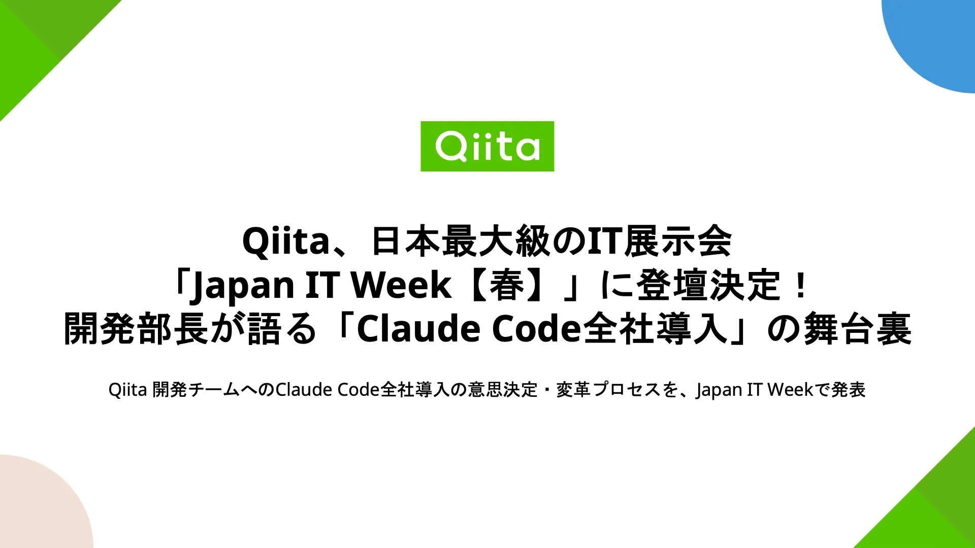 Qiita株式会社ではこれまで、エンジニアに関連する「Qiita」をはじめとする各種サービスを、社内の開発チームの手でユーザーに届けてきました。昨今はAIを活用した開発にも積極的に取り組んでいます。その知見を「Japan IT Week【春】」のセミナーでお届けすることにより、ソフトウェアの開発や、開発を支えるエンジニアの業務効率の向上に貢献できる場と考え、本セミナーの登壇に協力することを決定しました。