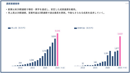 2025年度通期の業績は、売上高95億4600万円(前年同期比119.3%)、EBITDA39億7600万円(前年同期比182.9%)、営業利益36億2200万円(前年同期比193.0%)、当期純利益23億9700万円(前年同期比214.3%)となりました。売上高、営業利益ともに過去最高を更新し、中期経営目標「Milestone2025」で掲げた営業利益35億円を上回り達成しました。投資有価証券の減損処理を吸収した上で、当期純利益は前期比114.3%増となりました。