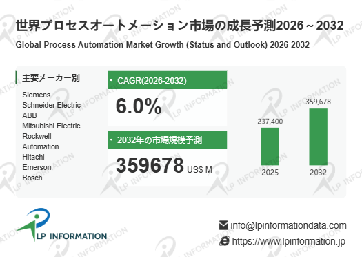 LP Informationの最新「世界プロセスオートメーション市場の成長予測2026~2032」( (リンク ») )によると、グローバルプロセスオートメーション市場は2026~2032年の予測期間において年平均成長率6.0%で拡大し、2032年には市場規模が3596.78億米ドルに達すると見込まれている。この成長は単一産業に依存するものではなく、製造業全般、エネルギー、インフラ分野に広く分散している点が特徴である。新興国の設備投資回復と先進国の高度化投資が同時に進むことで、地域間の需要バランスも安定している。LP Informationは、この市場規模の拡大が中長期的に企業価値評価の重要な前提条件になると考えている。