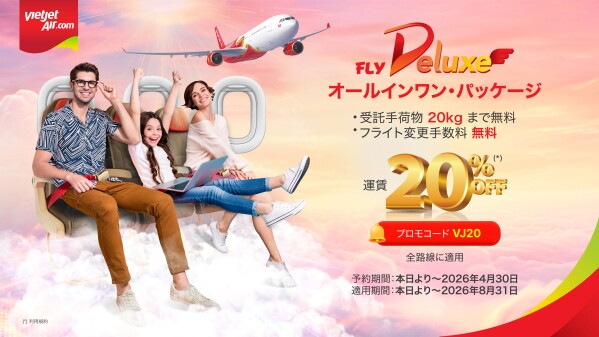 (東京, 2026年4月14日) - ベトナムの祝祭日期間を前に、ベトジェットは日本とベトナム間を含む全フライトネットワークを対象に、デラックスクラス、スカイボス、ビジネスクラスの航空券が最大20%割引(税・手数料抜)で購入できるチケットプロモーションを実施します。