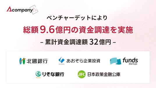 株式会社Acompany(アカンパニー、愛知県名古屋市中区、代表取締役CEO 高橋 亮祐、以下Acompany)は、北國銀行、あおぞら企業投資、Funds Startups、りそな銀行、日本政策金融公庫からベンチャーデットにて総額9.6億円の資金調達を実施しました。今回の資金調達で累計資金調達額は32億円となりました。調達した資金は、「Confidential AI(機密AI)」領域の製品開発・研究開発および専門人材の採用強化に充当します。